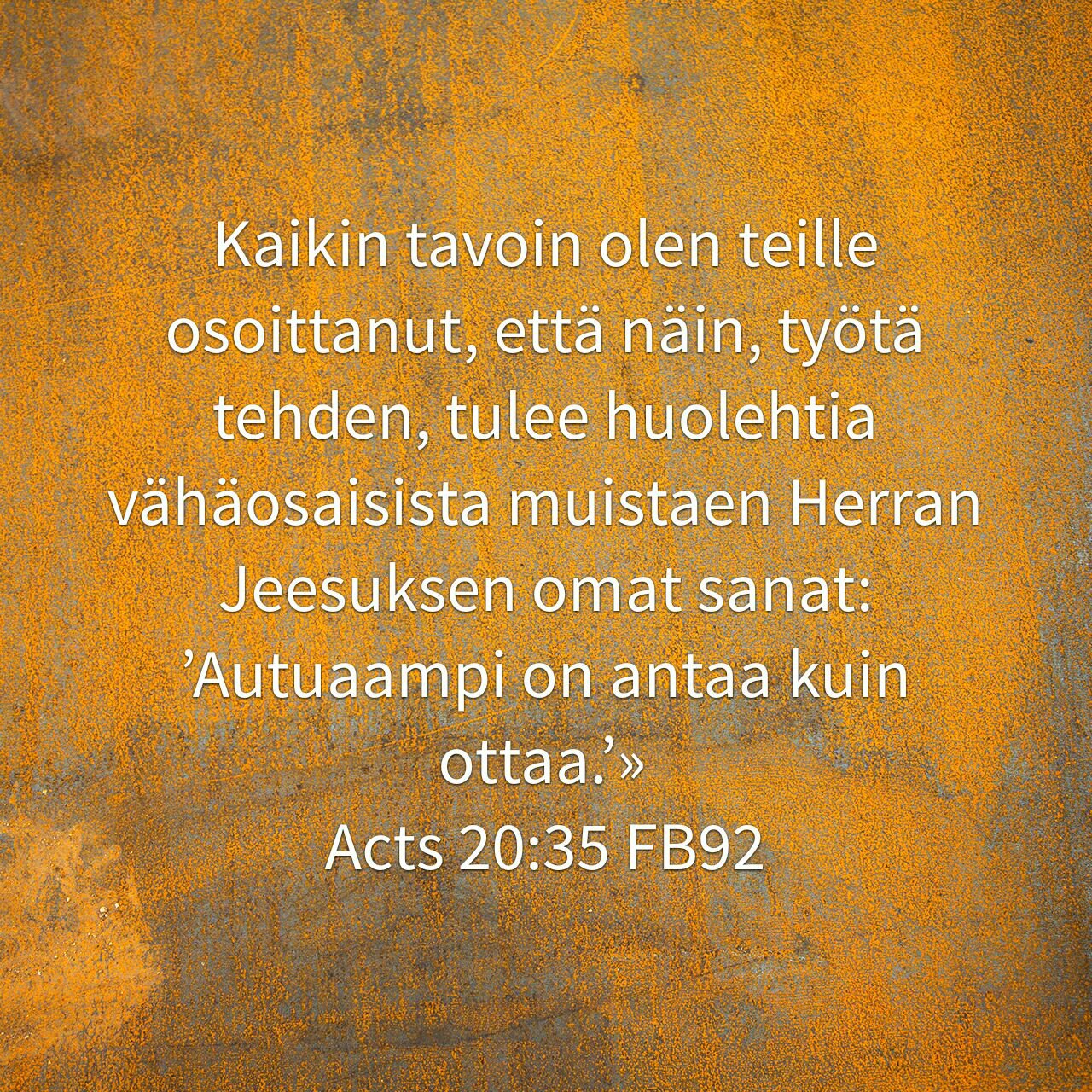 Kaikin tavoin olen teille osoittanut, että näin, työtä tehden, tulee huolehtia vähäosaisista muistaen Herran Jeesuksen omat sanat: ’Autuaampi on antaa kuin ottaa.’»